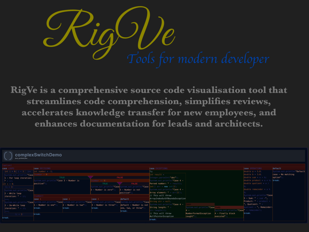 RigVe is a powerful source code visualisation tool designed to streamline code comprehension, simplify reviews, accelerate knowledge transfer for new employees, and enhance documentation for leads and architects.